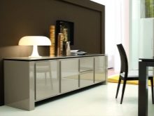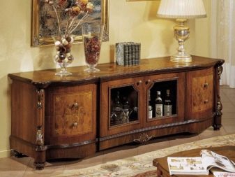 Дълъг бюфет със скрин ще се впише в хола, декориран в класически стил. В същото време тя не изглежда обемиста и не зарежда стаята..