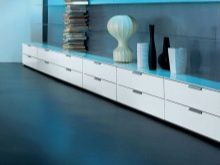 Нисък дълъг скрин на достъпна цена често се прави от ПДЧ или МДФ. Ако искате да закупите мебели от масивно дърво, ще трябва да платите голяма сума. Решаващите съображения при избора са материалните възможности и размерите на конкретна всекидневна. Продукт с малка височина е по -практичен от голям: поставяйки възглавници, можете да го използвате като импровизирана седалка.