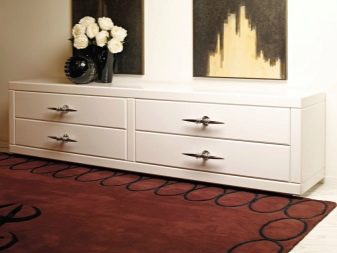 Нисък дълъг скрин на достъпна цена често се прави от ПДЧ или МДФ. Ако искате да закупите мебели от масивно дърво, ще трябва да платите голяма сума. Решаващите съображения при избора са материалните възможности и размерите на конкретна всекидневна. Продукт с малка височина е по -практичен от голям: поставяйки възглавници, можете да го използвате като импровизирана седалка.