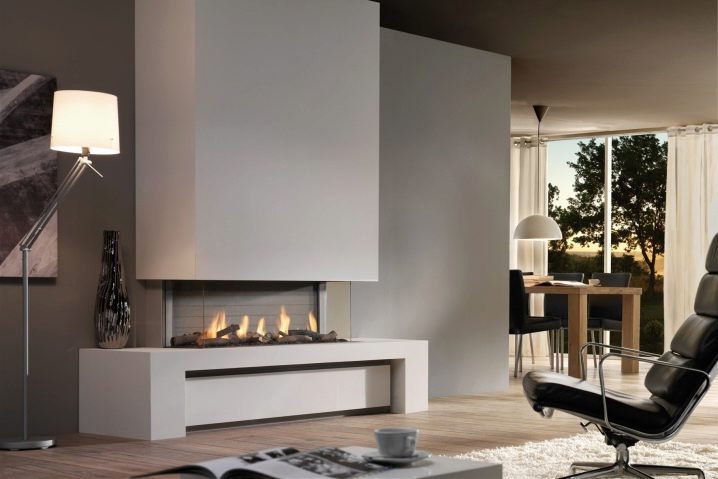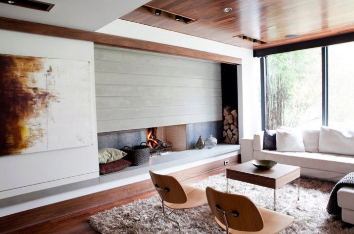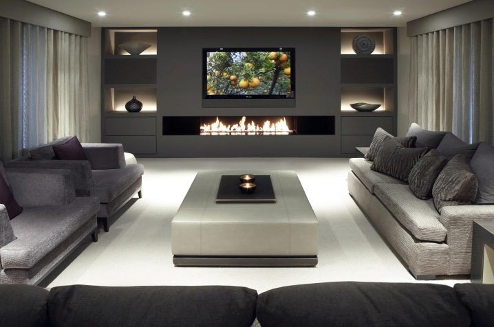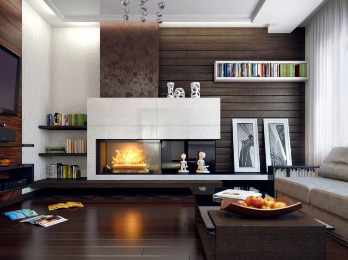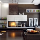 Интересно решение би било да инсталирате камина от отворен тип на стена с прозрачно стъкло и дебели лаконични бели портали срещу сива стена. Строгите форми на мебелите ще създадат неформална атмосфера, както бизнес, така и уют. Фигура 3