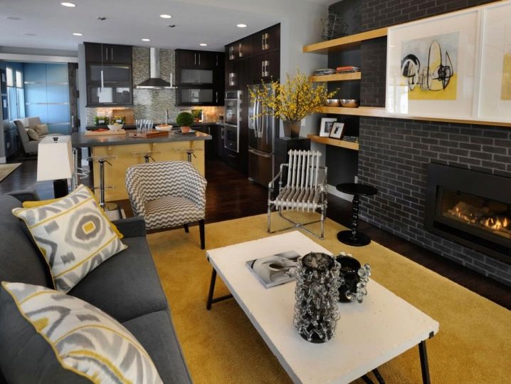 Днес стилът на таванското помещение е особено актуален (ако стаята позволява), а камините в този интериорен стил изглеждат по -необичайни. Отворена камина, окачена на стената, ще бъде добър избор и оригинален елемент на стаята, който ще й осигури топлина и привлекателно и уютно място за събиране на гости. Поставете „огнището“ в средата на стаята и подредете удобни мебели като столове или дивани с различни цветове и форми наоколо.
