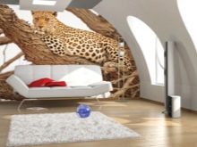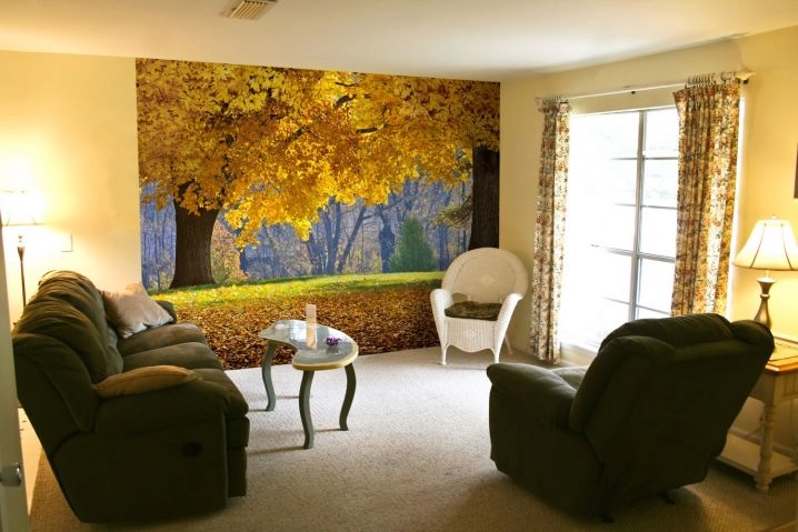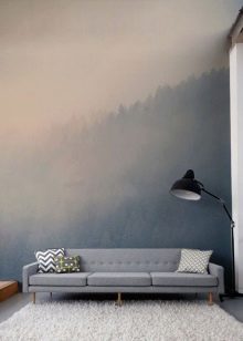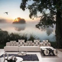 Най -простото и правилно решение би било да поставите тапета на стена, свободна от мебели. В този случай е възможно да се разгледа целият сюжет на чертежа. Можете да създадете кът на спокойствие, за да се насладите на пейзажа с изглед към планините, гората или морето, като инсталирате маса и няколко фотьойла до такава стена, където ще се отпуснете след тежки дни. Ако не можете напълно да освободите стената, можете да използвате фототапет, чийто сюжет няма да бъде силно засегнат, ако частите му са затворени..