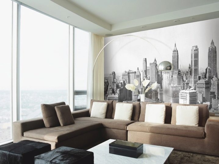 - Модерни стилът на хола ще бъде допълнен от фототапети от всякаква тема. Ще бъде важно да ги комбинирате с цвета на мебелите и интериорните детайли..