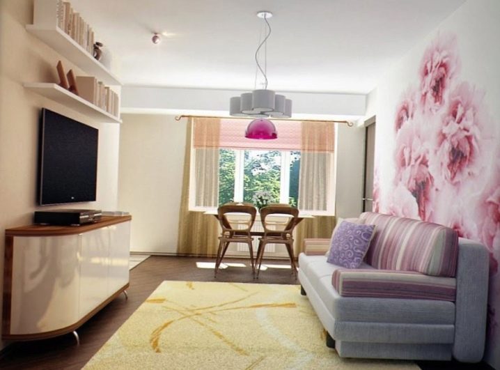Дизайнът на хола е типичен хрушчов. Изборът е направен в полза на романтични божури на бял фон. Останалите елементи в стаята са подбрани в приятни бежови тонове. Целостта на изображението се постига чрез съвпадение на цветови елементи (тапицерия на лампа и диван).