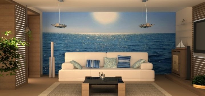 Наситеният тюркоазен цвят на морския пейзаж успешно ще подчертае пясъчния завършек на стаята. Естествените материали за мебели и компетентното осветление ще допълнят визията. Създавайки хол в средиземноморски стил, можете да се насладите на морето, без да излизате от апартамента си.