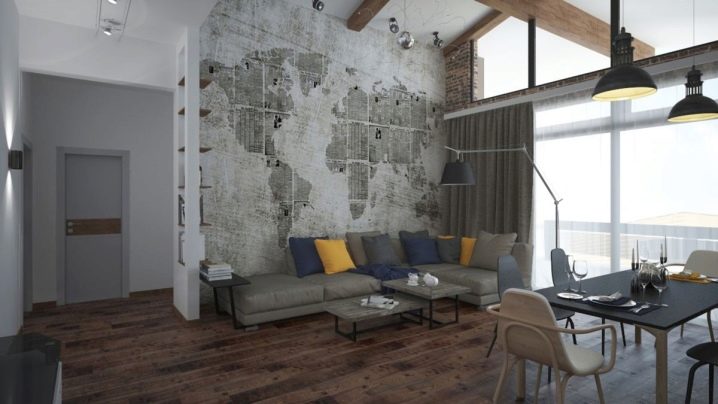 Всекидневна в тавански стил. Монохромна карта на света помага да се подчертае зоната за отдих. Наличието на ярки възглавници оживява стаята, правейки я уютна. Огромни прозорци, които заемат цяла стена, позволяват използването на предимно тъмни цветове в дизайна.