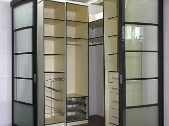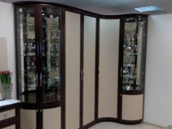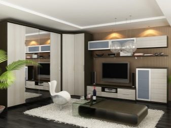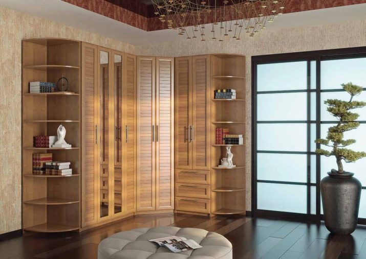Модулните ъглови мебели имат много шкафове, чекмеджета, стенни рафтове с различни размери и форми. Това улеснява намирането на място за всеки декоративен или необходим елемент от интериора. Модулите са компактни и просторни. Ъглов гардероб, често използван като съблекалня, често е една от основните декорации на залата..