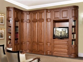 Избирайки най -добрия модел за вашия хол, трябва да вземете предвид неговата дължина, ширина, вътрешна структура, съответствие с общия стил. Изборът на модулни комплекти позволява да се използват всички свободни ъгли. Вратите на шкафа могат да бъдат пренаредени за лесно отваряне.