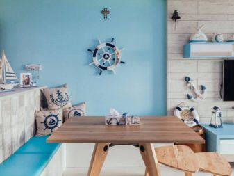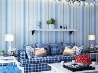 - Ако сте избрали морска тема за декориране на хола, важно е да поставите волана на стената, да изберете тапет със сини райета.