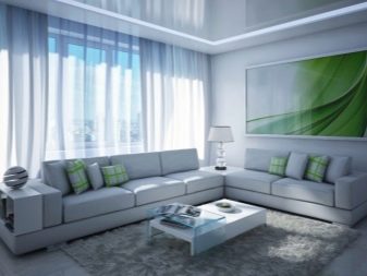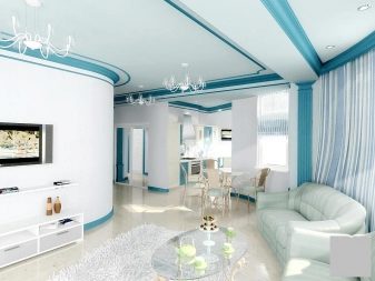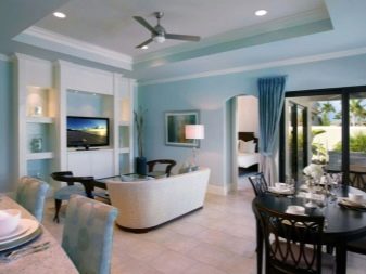 Таванът трябва да съответства на цялостния интериор. Изберете чисто бял нюанс. Определено ще бъде печеливш. Ярките мебели за всекидневна в сини нюанси са идеални, ако основният цвят е светъл. Обърнете внимание на тюркоазените, млечни, сини нюанси. Мебелите в тази цветова схема ще бъдат в хармония с останалата част от интериора..