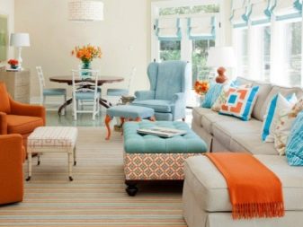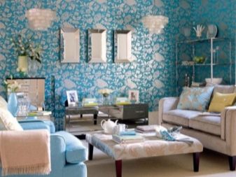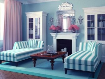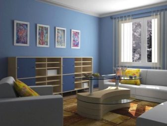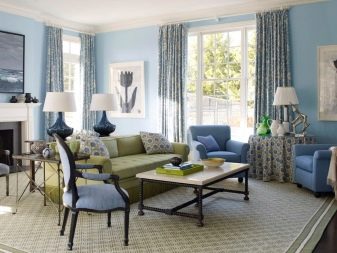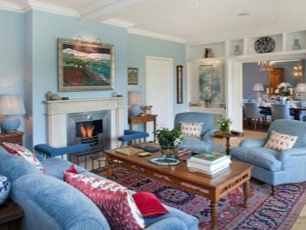 За ярки сини нюанси на хола изберете светли мебели в пастелни цветове, за светлосини стени ярки мебели са добри. За да предотвратите скуката на интериора, разредете сините и контрастни тонове с весели цветове..