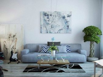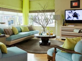Трябва да украсите интериора, така че да се чувствате комфортно в такава всекидневна. Можете да използвате шам фъстък, лимон, лавандула, златни, сребърни нюанси. Ако не можете да украсите залата сами, свържете се със специалист за помощ..