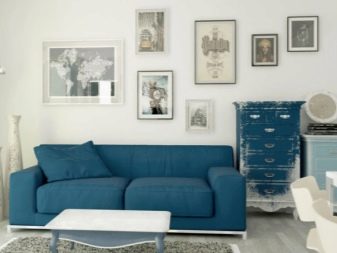 Белите мебели ще направят вашите сини стени изпъкнали, но се нуждаят от подходяща поддръжка. Ако имате животни, които могат да съсипят мебелите за секунди, най -добре оставете тази идея зад себе си. Фокусирайте се върху дървените мебели. Ако белият тон вече е избран, можете да закупите евро покривала: те надеждно ще предпазят тапицерията от ноктите на домашни любимци и ще опростят грижите за мебелите. Така че можете да съберете различни диван и фотьойли, като им придадете вид на една слушалка..