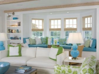 Цветният акцент може да се направи по различни начини. Например, струва си да подчертаете тавана, да го направите синьо като небето или да го избелите. Варосаният таван ще даде на хола чисто усещане..