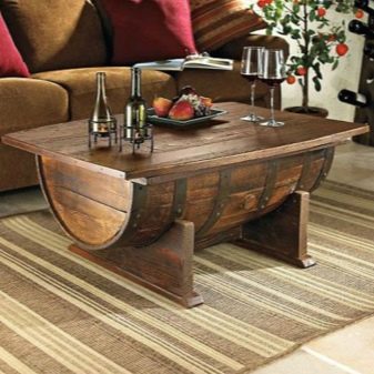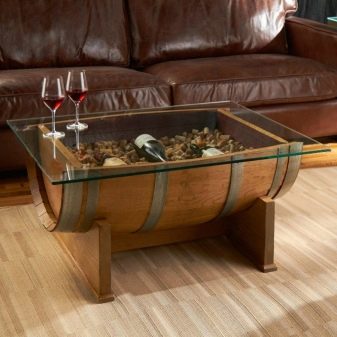Оказва се, че бурето за вино крие много декоративни възможности. Можете да го разрежете по дължина и да прикрепите краката към кръглата му част, а горната част да затворите с дървен или стъклен плот. Във втория случай самата цев може да се напълни с декоративни вещи – черупки, сухи клони и пр. Има и друг вариант: отрежете горната част на цевта и вдигнете върху нея кръгъл дървен материал.