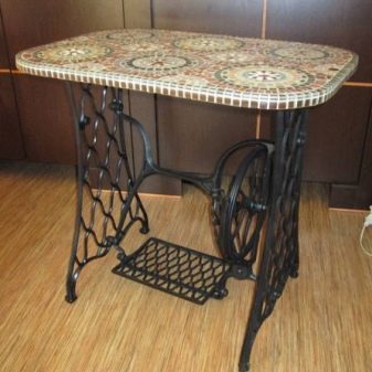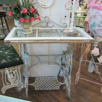 Стара шевна машина с метални къдрави крака също има потенциал. Те трябва да бъдат внимателно шлифовани и пребоядисани, например злато или бронз. Самата шевна машина не е полезна, вместо нея обикновено се поставя парче закалено стъкло.