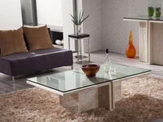 Стъклените маси са идеални за високотехнологични интериори. Визуално те не намаляват пространството и подчертават минимализма в интериора. По правило само плотът на масата е от стъкло, а краката са от метал или дърво. Недостатъците на стъклените интериорни предмети включват драскотини, чипове, които се появяват при небрежно боравене. Препоръчително е да изберете закалено стъкло, тъй като то е по -здраво и по -издръжливо.
