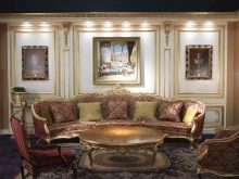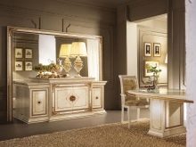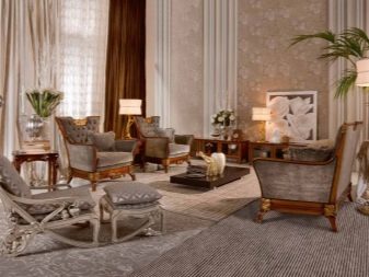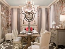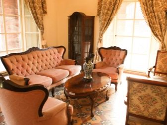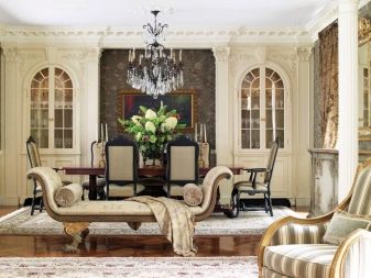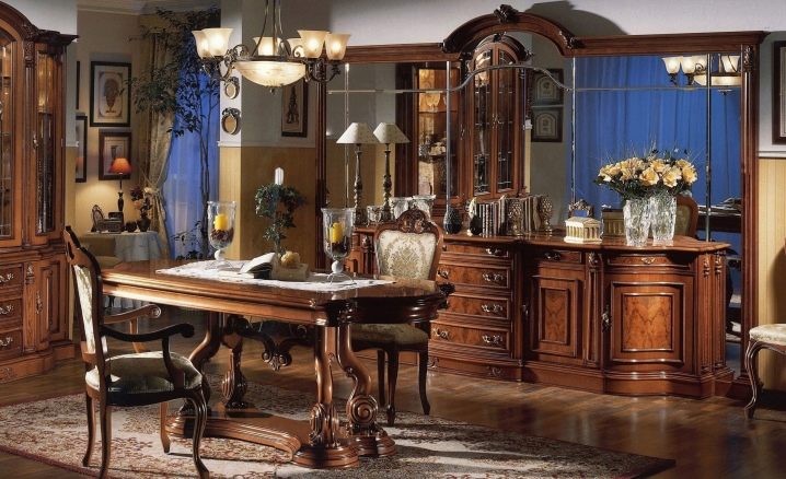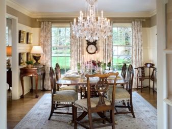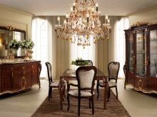 Масивни дивани и фотьойли от естествени материи в богати цветове ще ви накарат да се чувствате комфортно. Столове на плътни крака, украсени с издълбани шарки, голяма маса с правилна форма може да направи прекрасен ансамбъл за трапезарията.