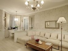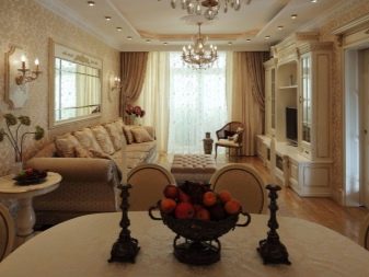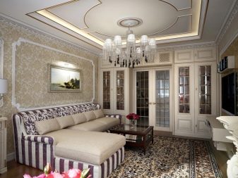 Светло бежови и пясъчни нюанси в хола 19 кв. m не стискайте място. Мазилка и огромен полилей с фалшиви свещи са балансирани от миниатюрна масичка за кафе и лек килим със златен модел.