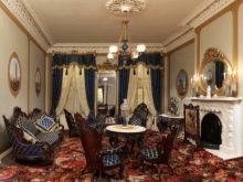 Кралски интериор с изобилие от златни, тъмни мебели допълва избора на богата тапицерия за меки слушалки.