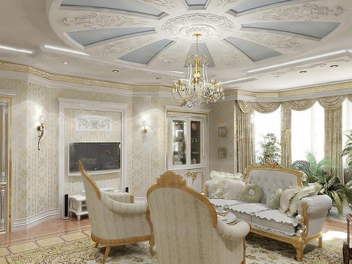 За предпочитане е таваните да бъдат завършени в светли цветове, отново, за да се подчертае обемът на хола. Картината и фризовете ще изглеждат печеливши и луксозни.