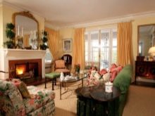 Великолепният стил рококо е подчертан от елегантно огледало в позлатена рамка и масивна бяла камина.
