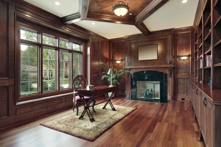 Дървото може да преобладава в декорацията на стени и подове. Тъмните нюанси на редки дървесни видове ще подчертаят богатството на собствениците. Венге, череша, дъб, махагон, карелска бреза ще бъде вашият успешен избор.
