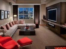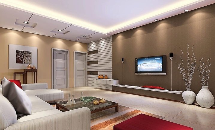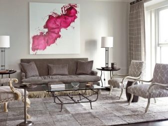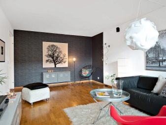 В същото време в модерен интериор трябва да направите няколко ярки акцента, било то червени столове, червени рамки за картини или ярки възглавници на дивана. Освен това за тази цел можете да използвате необичайни цветове, оригинални маси за кафе или килими..