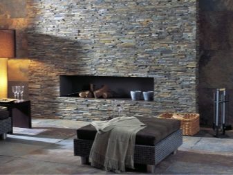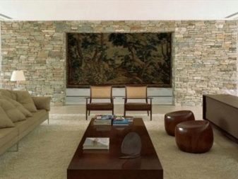 Важна особеност е изборът на довършителни материали, подходящи за модерни дневни. Естественият камък е перфектен, както и неговите изкуствени аналози, които външно наподобяват оригинала. Те имат интересна, необичайна текстура и се вписват идеално в съвременния интериор. За малки помещения е по -добре да изберете изкуствен гипсов камък или мазилка.