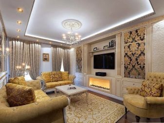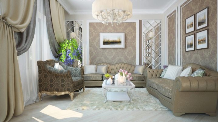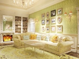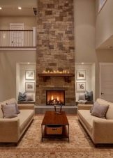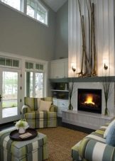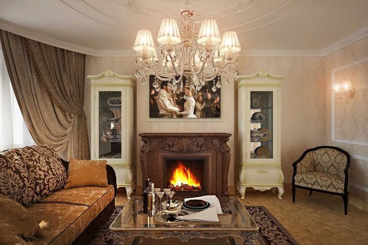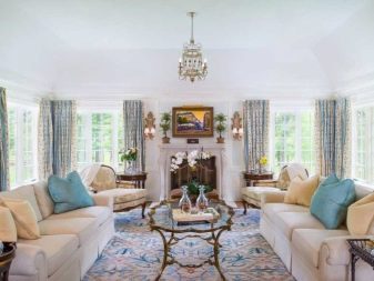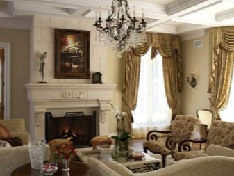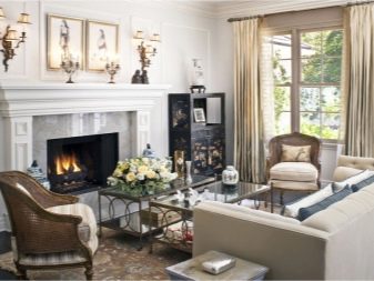 За да придадете на интериора лукс и комфорт, в такава стая може да се постави камина. Красиви саксии, свещници от ковано желязо, картини и красиви рамки се използват като декоративни елементи. В този случай е по -добре да използвате сдвоени елементи, за да постигнете ясна и правилна симетрия..