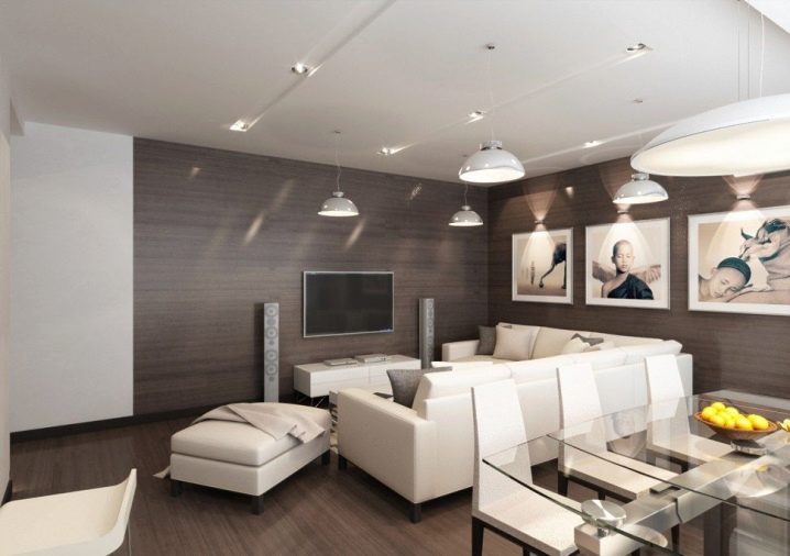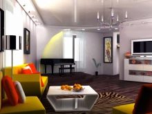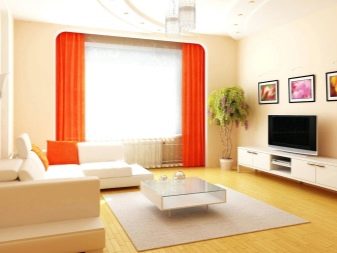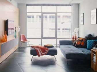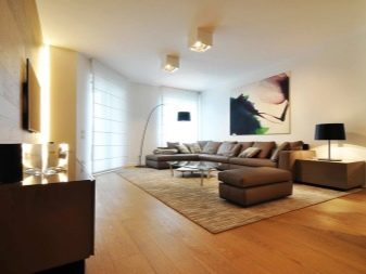 Можете да украсите такава всекидневна с помощта на различни покрития. За довършване на пода на такава стая дизайнерите препоръчват използването на дърво, паркет или ламинат..