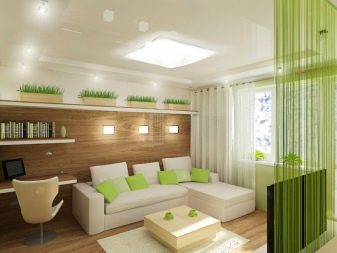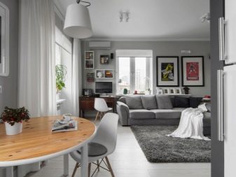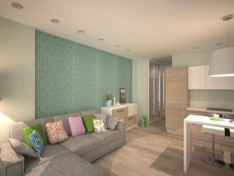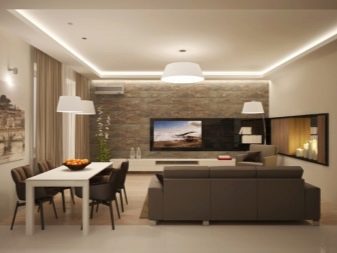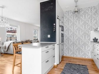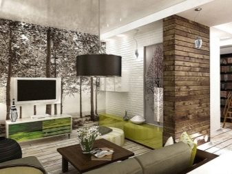 Зонирането може да се извърши с помощта на различни стенни покрития. За зоната за гости е по -добре да изберете по -спокоен дизайн, поставяйки акценти само с помощта на мека мебел или картини, фигурки, книги. Зоната за хранене може да бъде украсена по -ярко и интересно, като изберете ярки столове и ястия.
