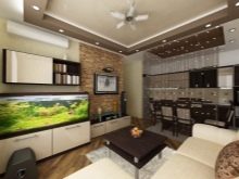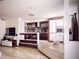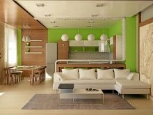 Апартаментът може да комбинира и хол с кухня. Тези две зони могат да бъдат разделени с малка преграда (не е задължително да е плътна), стелаж или бар брояч. Можете да вечеряте зад бара, но можете да го използвате само като преграда. Седейки зад бара, можете да готвите и да гледате телевизия, разположена в хола. Тази опция за зониране е много удобна..