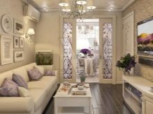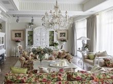 Следващата възможност за дизайн на хола е използването на стила на Прованс. Това предполага наличието на френски мотиви. За подреждането на такава всекидневна е по -добре да използвате покрития и мебели от деликатни шам фъстък, розово, лавандула, светлосини нюанси.