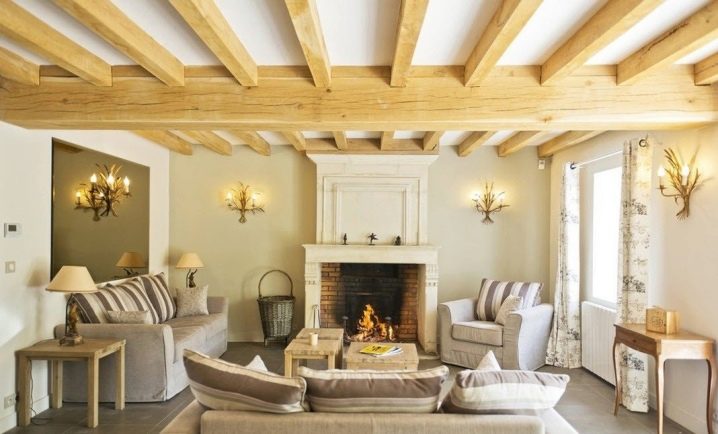 Ако стаята е малка, тя трябва да бъде декорирана в по -светли нюанси. В последния случай дървените варианти са подходящи и за декорация. Таванът също може да бъде направен да изглежда като дърво. Така че можете да създадете интересен и уникален селски стил, който е актуален в съвременния интериор..