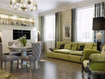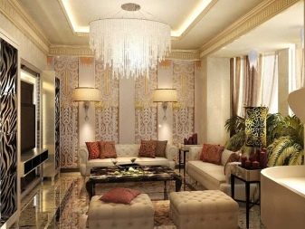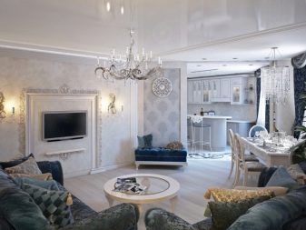 Можете да комбинирате различни елементи: обикновен окачен таван и интересен изкуствен полилей, тапет с копринена екранировка. Можете да направите акценти, като окачите луксозни картини и красиви фотографии. В помещенията трябва да има много прозорци и огледала..