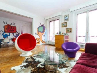 Интериорът на хола в стил поп арт е ярък и пъстър. Тази опция се счита от дизайнерите за най -интересна и уникална. В такава стая можете да поставите голям диван под формата на устни, масичка за кафе от прозрачна пластмаса, върху която лежащите неща буквално ще се носят във въздуха.