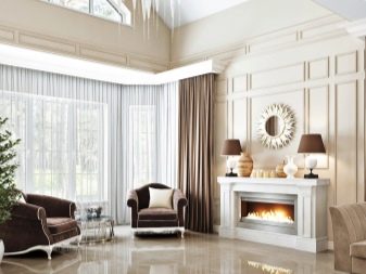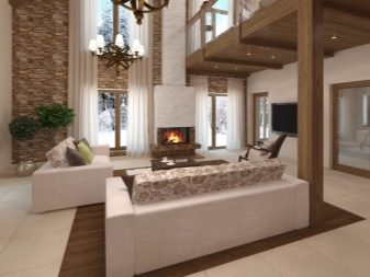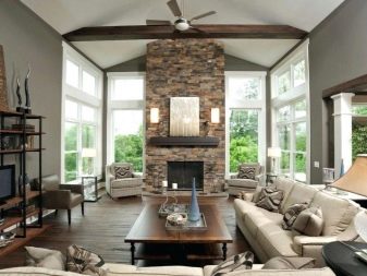 Използването на естествени материали само ще подчертае лукса на стаята.. Естествен мрамор, камък, дърво – всичко това е перфектно съчетано с естествена слънчева светлина. Камините, декорирани с естествен мрамор или камък, изглеждат особено привлекателни. Би било разумно да се организира зона за отдих в близост до такива източници на топлина..