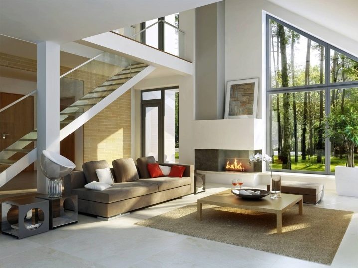 На първото ниво на хола добро решение би било да инсталирате камина. Тя може да бъде изкуствена или истинска. Тази идея ще ви позволи допълнително да затоплите стаята и да й придадете аристократичен блясък.. Ако холът е комбиниран с кухнята, има смисъл да поставите малка отоплителна печка в него. Освен това трябва да обърнете внимание на формата на самата стая. Тя трябва да бъде просторна и квадратна. Препоръчва се визуално да се намалят стените, така че стаята да не изглежда „дълбока“. За това много използват метода на хоризонталното разделяне, но има много други техники за проектиране..