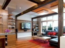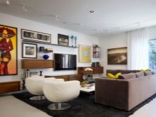 При проектирането на хол е необходимо да се определи местоположението на телевизора. Площта на стаята е от особено значение. В компактна всекидневна ще бъде нерационално да окачите голям плазмен панел на стената по простата причина, че размерът на стаята няма да ви позволи да седнете удобно за гледане. Оптималното разстояние за гледане е това, което е равно на два диагонала на устройството. Малките дневни няма да могат да отговорят на това изискване..