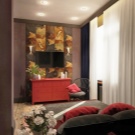 Това може да бъде контрастен тапет, подчертаващ точно частта от стената, на която е разположен телевизорът, фототапет, тапет с 3D ефект, залепен за цялата стена. Подходящо е стената да се боядисва частично (пространство близо до телевизора), да се подчертае с помощта на мазилка, бамбуково платно, текстилни елементи, тухлена или каменна декорация.