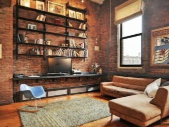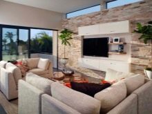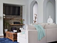 Популярните сега повърхности, направени от камък или тухла, ще бъдат подходящи в стила на таванско помещение или всяка друга модерна посока. На бяла стена, облицована с тухли, телевизорът ще изглежда особено изгоден. Не е възможно да се покрие цялата стена с камък или тухла, а само частта, върху която се намира устройството..