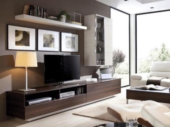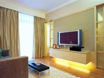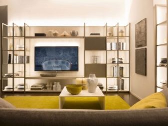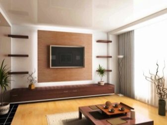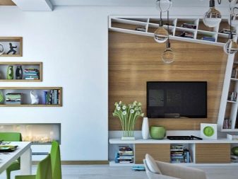 Това могат да бъдат ниши, стелажи, рафтове, модулни мебели, стенни панели. Техните параметри зависят от модела на телевизора. Мебелите са подбрани така, че нюансът да е контрастен. Нишите се подрязват, за да съответстват на основната стена, или се залепват със самозалепващи се, боядисани.
