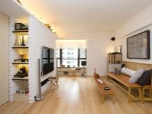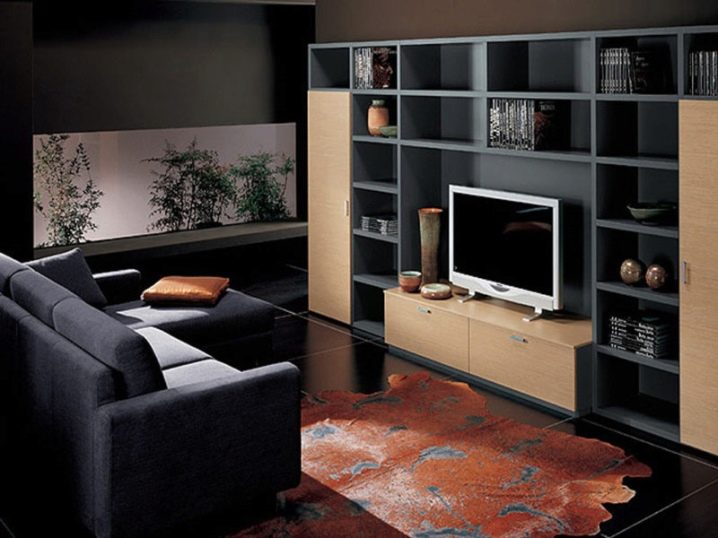 Ако стаята е малка и изпълнява няколко функции едновременно (например това е хол и спалня или хол и офис), най -доброто решение би било да се използват мебели, които осигуряват място за телевизор. Най -често се намира в центъра на правоъгълник, образуван от рафтове, странични стелажи и бордюр. В този случай можете да поставите декоративни елементи, книги и други дреболии по рафтовете и стелажите. Бордюрният камък може да бъде продължен с работна или тоалетка.