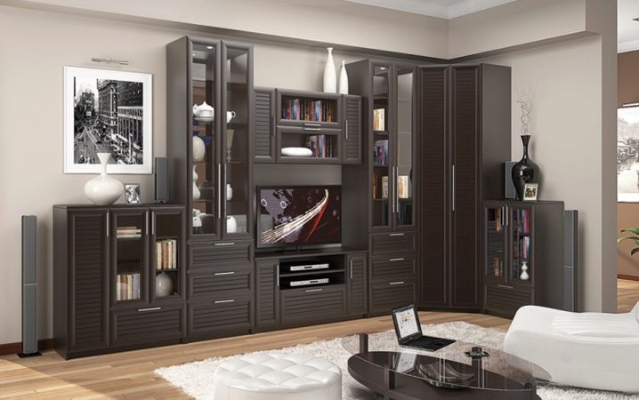 Често корпусните мебели се състоят от няколко части. Рафтове за книги, рафтове, място за телевизор, шкафове, стъклени рафтове и малък скрин или гардероб изглеждат страхотно в интериора, защото всички тези елементи са направени в една и съща цветова схема и стил.