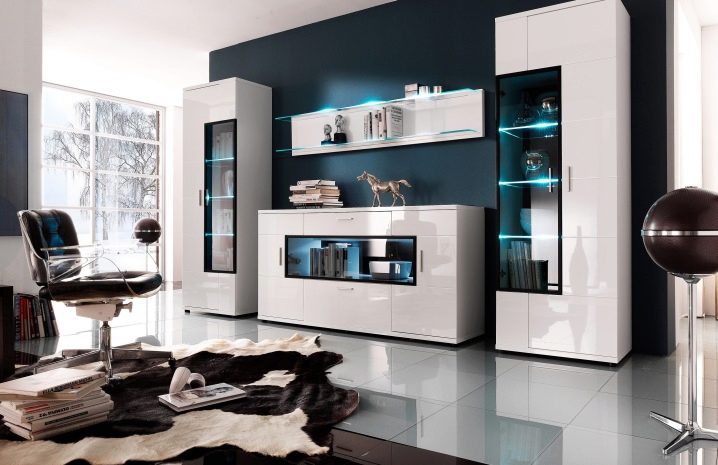 - Висока технология. Съвременните стилови тенденции доведоха до появата на нов и модерен дизайн, наречен „високотехнологичен“ на пазара. Този стил на интериор често се избира от млади клиенти, които охотно вървят в крак с времето. Корпусните мебели в този стил изглеждат много необичайни, често в неговите елементи присъстват метални, стъклени и лакирани елементи. Често такива мебели изглеждат необичайни и изглеждат като нещо от далечното бъдеще. Подсветката благоприятно подчертава красотата на такива мебели, оставяйки усещане за безтегловност и витаеща над пода.
