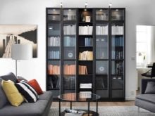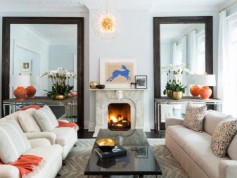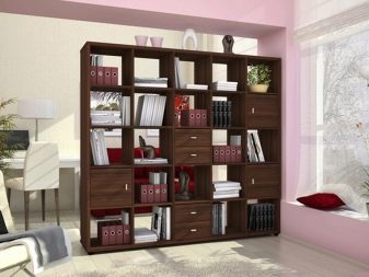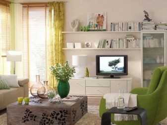 Някои експерти твърдят това най -добре е да подредите дървени скринове и стелажи за съхранение по периметъра на стаята. За да се разреди интериорът с цветни ярки цветове, е допустимо да има няколко големи картини или декоративни вази..