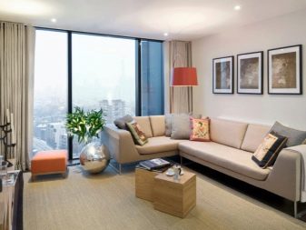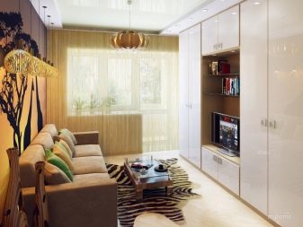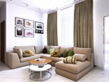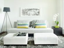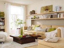 В малките стаи диван в светли цветове (бял, бежов, кремав) ще изглежда идеално; можете също да поставите тапициран фотьойл в подобна цветова схема наблизо. Перфектно се вписват в интериора и дървените елементи. В центъра на хола масичка за кафе, изработена от различни материали (стъкло, метал) ще изглежда благоприятно.