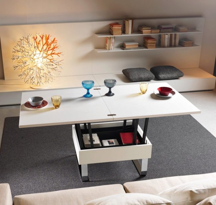 Сгъваемите маси за кафе също могат перфектно да се впишат в дизайна на хола. Те са практичен и удобен тип мебели. Благодарение на тях можете умело да спестите място в стаята. Често такива продукти идват с допълнителни отдели..