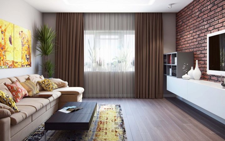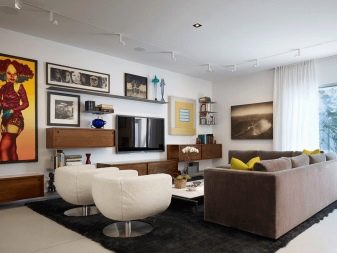 Важно е да запомните това всички компоненти на интериора не трябва да се открояват твърде много на общия фон на стаята. Силният контраст може да създаде неприятна атмосфера в хола. Често залите използват комбинация от кафяви и бели цветове, което допринася за визуалното разширяване на пространството..
